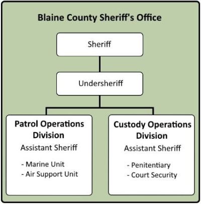 [Bearbeiten]Der Blaine County Sheriff untersteht direkt der Regierung von Blaine County und wird für eine jeweils vierjährige Amtszeit gewählt. Er leitet das Blaine County Sheriff's Office, welches in einer flachen Hierarchie organisiert ist: